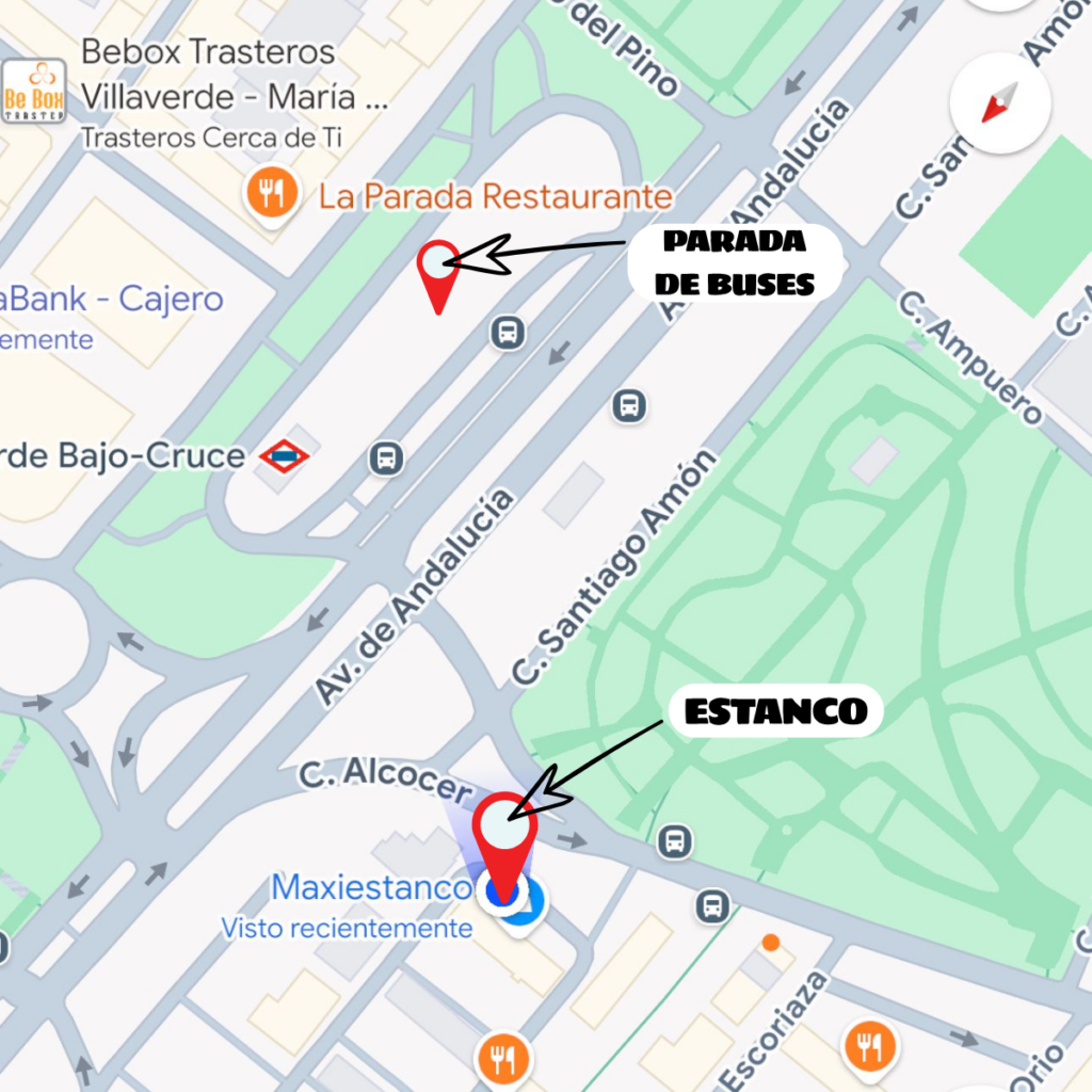 La parada de metro en la que te plantas prácticamente enfrente del estanco es «Villaverde Bajo-Cruce», y corresponde a la línea 3 de Metro.